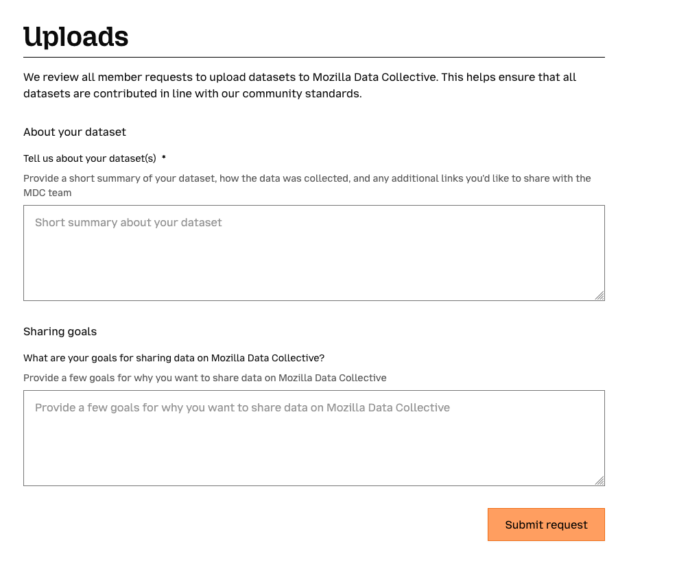 - New information requested when becoming an uploader. When you request to upload datasets to MDC, you will now be asked to fill out a short form with additional information about your datasets. Previously, the process for being approved had a member of our team emailing to collect this information. By making it part of the request flow, our team can more quickly review requests and get uploaders approved sooner!