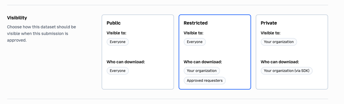 - Private - for temporarily withdrawing your dataset listing from the /datasets page